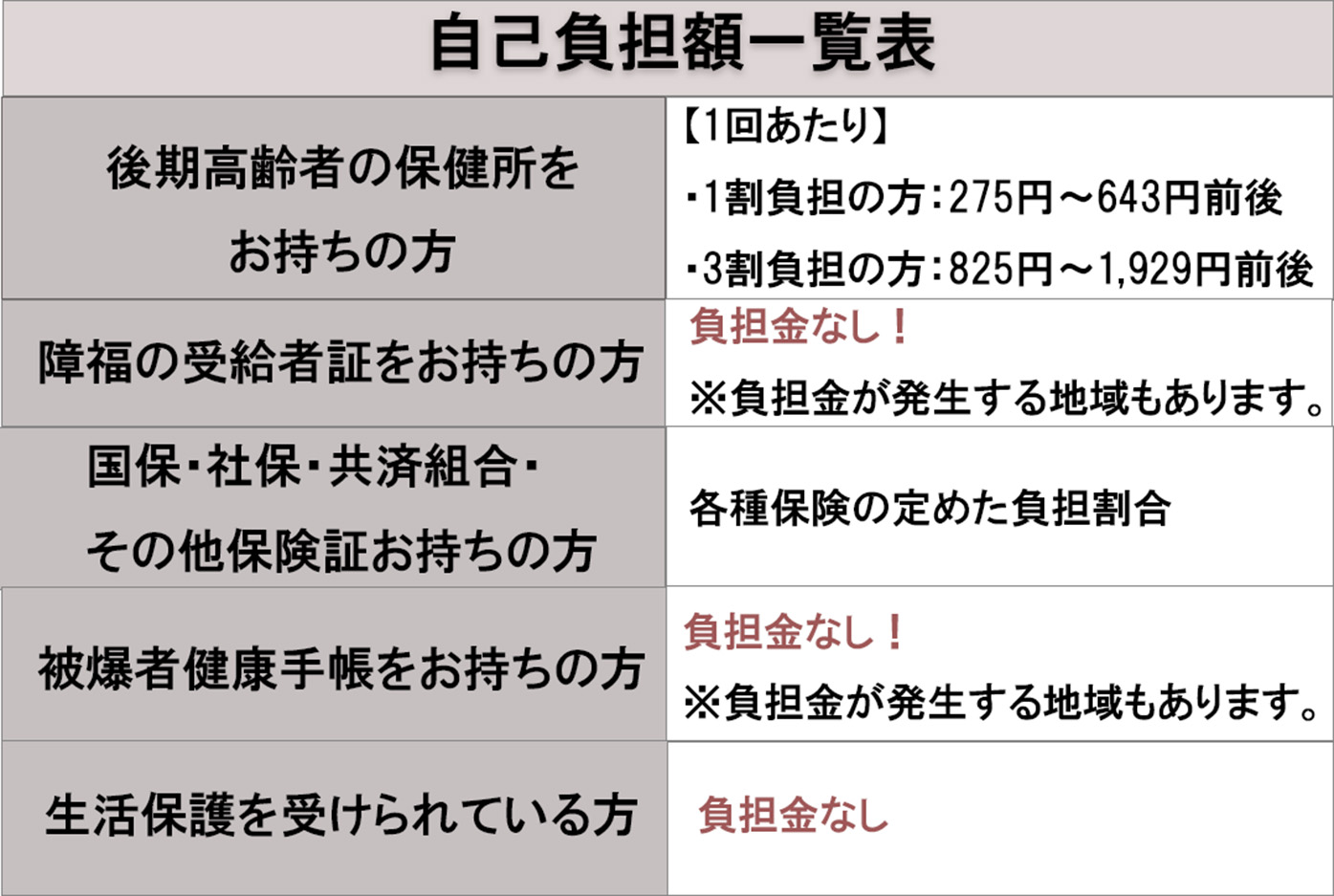 保険種類別の自己負担額一覧表です。